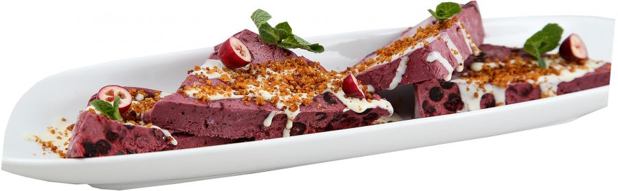 Melleņu parfē ar baltās šokolādes medus mērci un kukurūzas drupačām, 2 personām